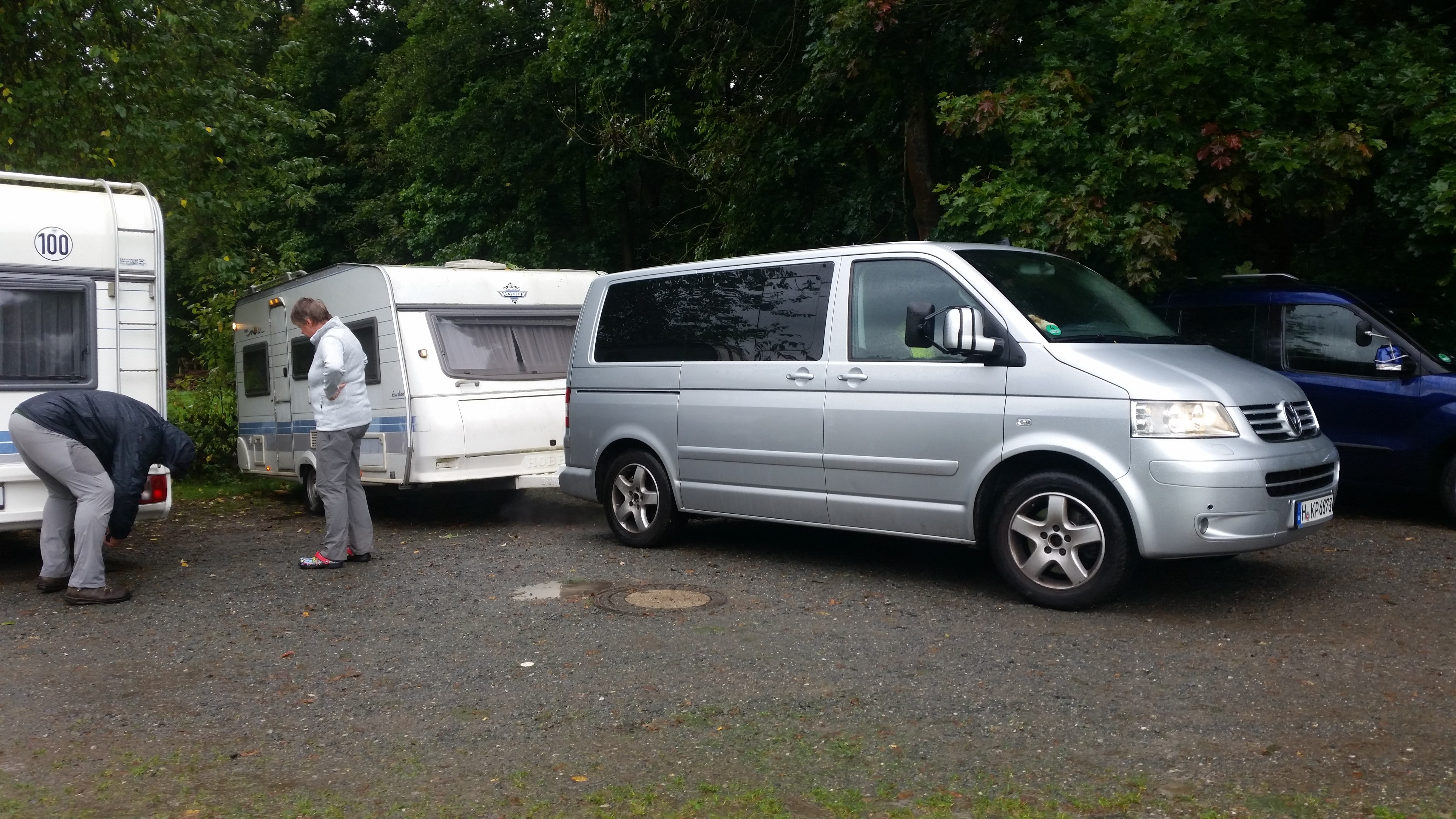 Und da waren die die beiden Charly und Sabine schon da. Sabine schwub die schwub zu mir rüber. Charly für vor und wir hinten drein… kurz nachdem wir wieder auf der Autobahn waren. Stau… Charly runter von der A7. Und Leute Kreisel an Kreisel fahren…. enge Landstr. Man war ich froh das ich geübt hatte. Sabine war sehr angetan wir ruhig und gelassen ich für meine erste Jungfernfahrt mit Wohnwagen war. Die Fahrt war dann schnell vorbei, Dank Sabine´s netter Gesellschaft verging die Zeit wie im Flug. Mit vereinten Kräften schoben wir die beiden Wohnwagen auf die gewünschten Stellplätze. Und begannen noch im hellen den Ring aufzubauen für Samstag. Was uns rechtzeitig vorm Dunkel werden gelang. Doch leicht K.O. ging es dann sehr schnell ins Bettchen für mich…