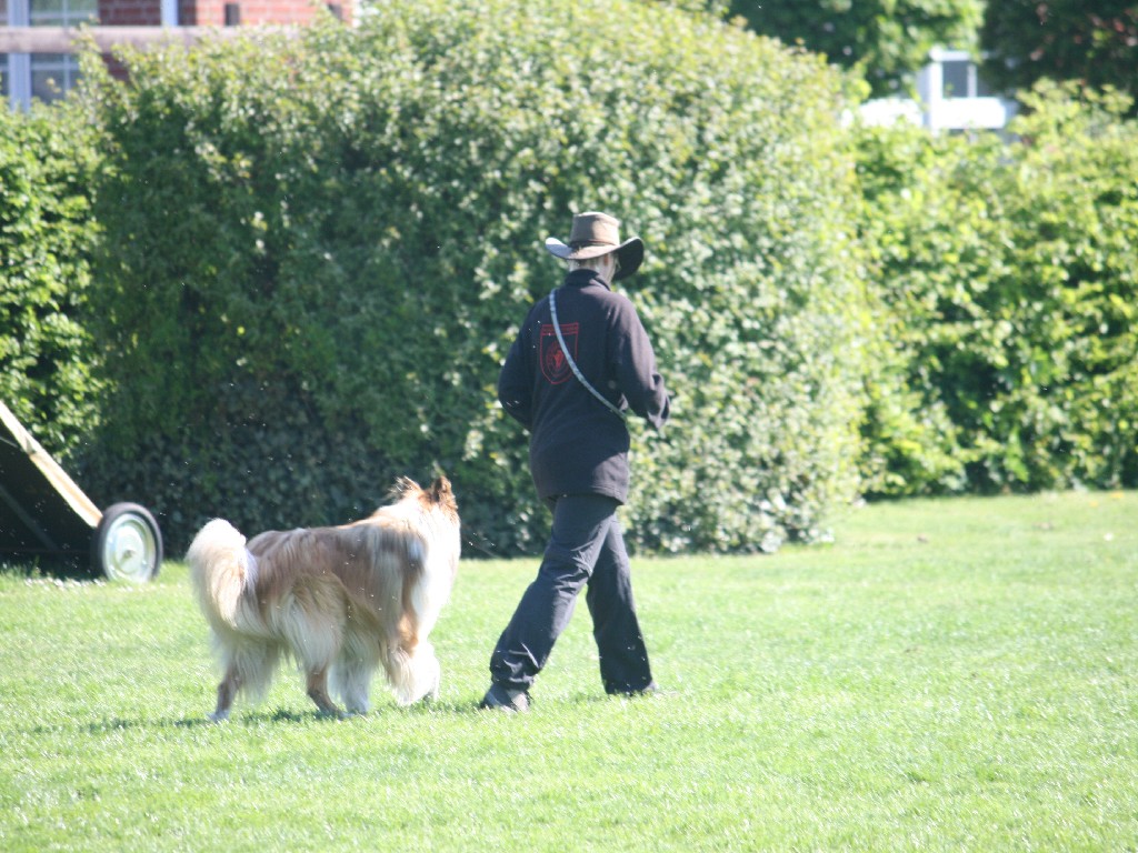 Tja kommt auch mal vor. Hunde sind auch nur Menschen. Was soll ich sagen, etwas Pech wäre ich etwas später gestartet wäre ich wohl durch gekommen bzw. durch gewuncken worden. Es war sehr heiß. Wir gingen als drittes Team auf dem Platz und als wir mit der Leinenführigkeit begannen stiegen lauter Tiere aus der Wiese auf. Das sieht man sehr schön auf den Foto´s. Das störte die Konzentration von Bandit und er konnte nicht sein volles Potential zeigen. Auch hatte Bandit mit meinem Stresslevel zu tun. Freifolge gar nicht mal so schlecht. Ablage war es dann vorbei mit seiner Geduld. In der prallen Sonne zu liegen ist auch gar nicht so einfach. Gelle